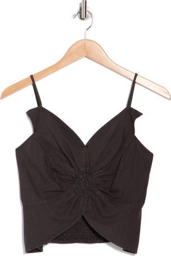 A sculptural linen‑blend cami top blooms with a petal‑like neckline, a tulip‑shaped hem and gathered center front, finished with back smocking for a comfortable, flexible fit.