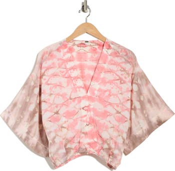 A surplice V‑neck and relaxed, draped sleeves complement the cropped silhouette of this tie‑dye top finished with an elastic waist for an easy, flattering fit.