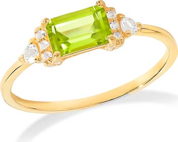 A mix of lab-created gemstones in two hues forms a prong-set baguette accented by four round faceted stones on each side for a statement-making ring to add to your daily stack.