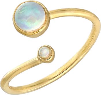 Milky bezel-set opals bring eye-catching sparkle to a delicate bypass ring plated in gleaming 14-karat gold.
