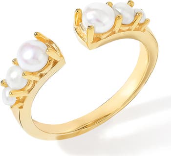 Prong-set cultured pearls take center stage atop a slim polished ring done in a split-shank silhouette for a modern look.