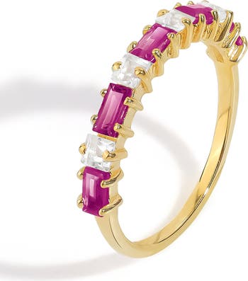 Alternating garnet and white topaz add vibrant sparkle to a slim band ring that can be stacked or worn solo.