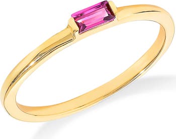 A symphony of alternating gemstones float along the slender band of a stackable ring finessed in fine 14-karat gold. This artfully designed style is dainty and demure enough for everyday wear.