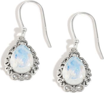 Smooth polished, teardrop moonstones shimmer in a scroll frame of a wire-hung drop earrings finessed from fine sterling silver. This artfully designed style is dainty and demure enough for everyday wear.
