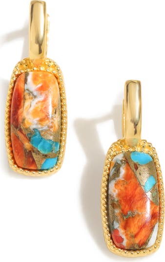 Warm 14-karat-gold plating shines on the setting of drop earrings centered by gorgeous oyster turquoise cabochons.