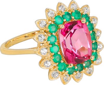 A bright-pink topaz surrounded by a row of green onyx and white-topaz halo makes a bold statement on this ring finished in high polish.