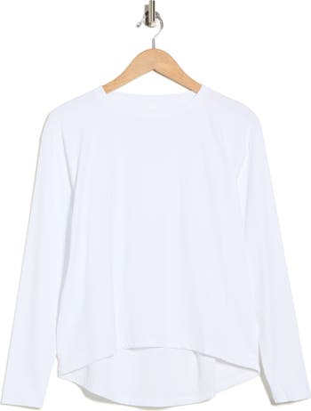 Hit up the yoga studio or just the couch in the superstretchy comfort of this long sleeve T-shirt textured with fine ribbing and cut with a high-low hemline.