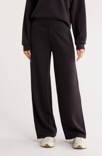 Relax or run errands in these ultrasoft scuba knit pants fashioned in a wide-leg silhouette with practical side pockets.