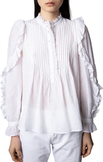 A serpentine ruffle wends its way down the sleeves of a crisp cotton-blend popover blouse with pintucks and ruffled edges adding to the romantic look.