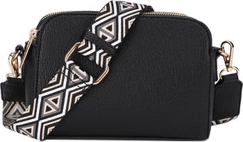 Multiple zippered compartments keep you organized with a compact vegan-leather crossbody fitted with a wide, comfortable webbing strap.