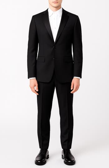 Satin accents on the notched lapels bring traditional detailing to a tuxedo styled with covered buttons on the jacket for a smart, streamlined finish.