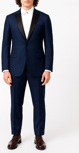 Satin accents on the notched lapels bring traditional detailing to a tuxedo styled with covered buttons on the jacket for a smart, streamlined finish.