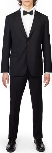 A versatile black hue distinguishes a wardrobe-staple suit that's tailored in a slim fit and fitted in the waist for a smart, formal look. The flat-front trousers complement the traditional detailing to keep the silhouette crisp and clean.