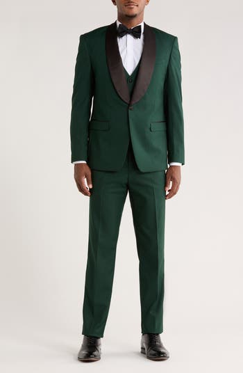 A satin shawl collar distinguishes a solid three-piece tuxedo crafted with an optional vest to help you modify your look and formality. The pleated trousers complement the traditional detailing to keep the silhouette crisp and clean.