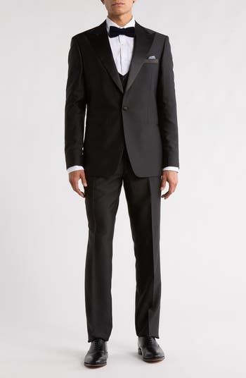 Satin peaked lapels distinguish a solid three-piece tuxedo crafted with an optional vest to help you modify your look and formality. The pleated trousers complement the traditional detailing to keep the silhouette crisp and clean.