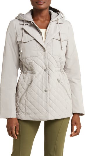 Lightweight quilting keeps you warm when you're out and about in this jacket that's topped with a hood that detaches to accomodate the changing weather.