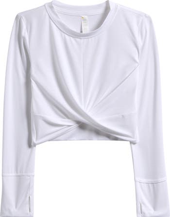 A twisty front detail gives a sporty vibe to this stretchy T-shirt with thumbhole cuffs that they'll love.