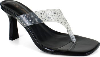 A transparent vamp strap and mid-height heel elevate this rhinestone-covered thong sandal into a true sparkle moment.