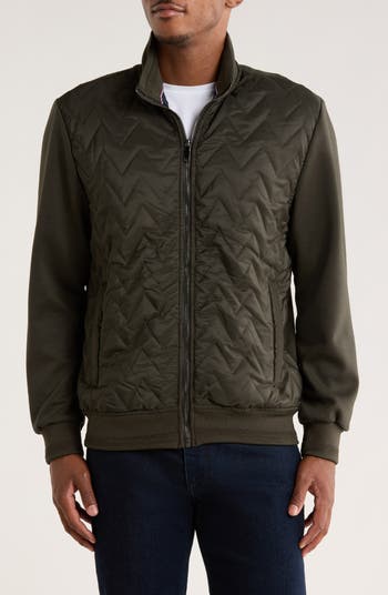 A stand collar punctuates this streamlined, zigzagged-quilted jacket finished with contrasting sleeves.