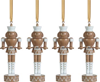 Four stylized nutcrackers stand with drumsticks at the ready in this set of minimalist hanging ornaments crafted in warm, natural tones.