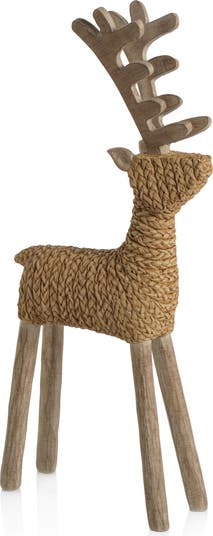 A rustic reindeer brings a charmingly homespun feel to seasonal decor, with a finish designed to resemble rattan and natural wood.