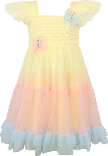 Sequined butterfly appliqués lend a dose of whimsy to this ruffled dress cut with a glittery tiered skirt for endless twirls.