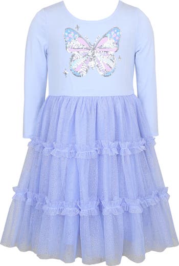 A tiered tutu skirt ensures endless twirls are had in this charming dress fronted by a sequined butterfly for kid-approved flair.