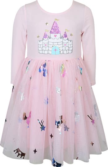 Foiled details on the tulle skirt and a sequined castle on the bodice bring princess energy to a charming dress framed by long sleeves.