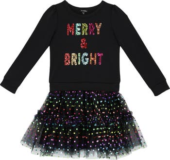 A sassy Halloween greeting done in vibrant sequins defines the bodice of this long-sleeve dress that flares out into a tutu skirt covered in rainbow foiled dots.