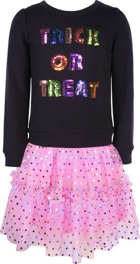 A sassy Halloween greeting done in vibrant sequins defines the bodice of this long-sleeve dress that flares out into a tutu skirt covered in rainbow foiled dots.