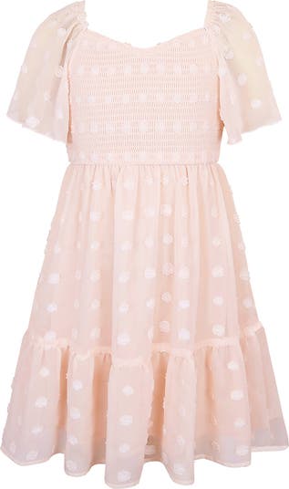 Fluttery ruffles, textured embelishments and smocking make this chiffon babydoll dress look incredibly sweet.