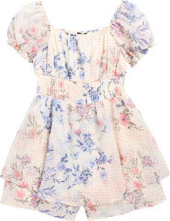 A smocked waist shapes this kid-approved puff-sleeve romper covered in a floral-and-dot print.