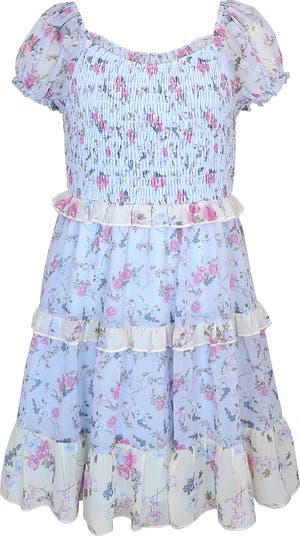 Playful ruffles accent each tier of this floral-covered dress designed with a smocked bodice and romantic puff sleeves.