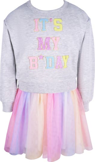 Have them feel extra special on their birthday in this long-sleeved dress fashioned with colorful letter appliqués and a pretty-pastel mesh skirt.