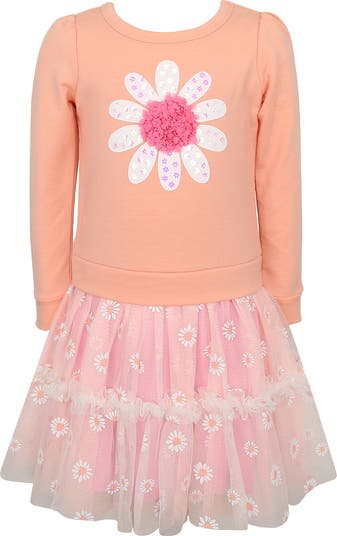 Your little sprout will fill in love with the shimmer of sequins over the long-sleeve knit bodice and daisies over the tutu skirt of a festive dress.