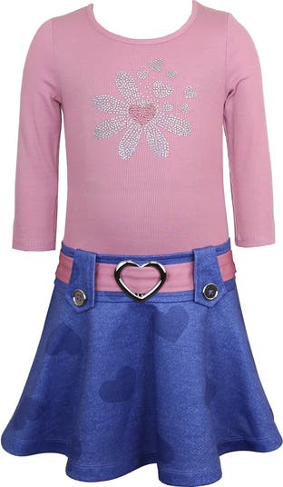 A flared denim skirt contrasts against the ribbed knit bodice of a mixed-media dress complete with a sequined flower.