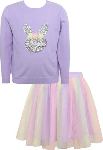 Your little darling will fall in love with the shimmer of sequins that dazzle the long-sleeve sweater and colorful layers of mesh tulle that complete this festive skirt set.