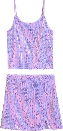 A mix of sequins shimmer all over this mesh set featuring a stretchy camisole and a matching skirt.