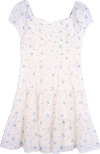 Your little one will feel their finest in this magical dress featuring a bright blue flower print over a ruched bodice for party-perfect style.