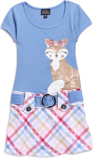 A plaid print skirt puts a little prep in this twofer dress style styled with a fixed-buckle belt and glitter appliqué.