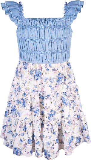 Denim meets florals in this adorable dress that is sweet, smocked, and ready to twirl.