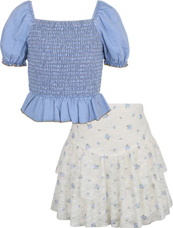 A smocked denim top pairs with a ditsy floral skirt in this adorable set that has your budding fashionista looking trendy and chic.