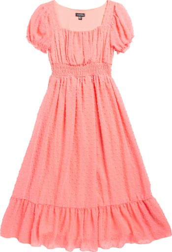 A smocked waist shapes this kid-approved puff-sleeve dress cut from charming swiss dot fabric.