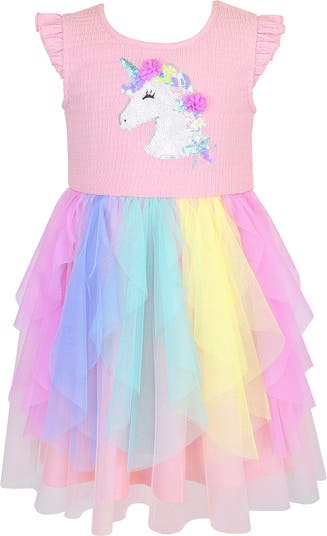 They'll feel as magical as the iconic mythical creature in this cap-sleeve dress showcasing a sequined unicorn at the bodice and styled with a rainbow tulle skirt.