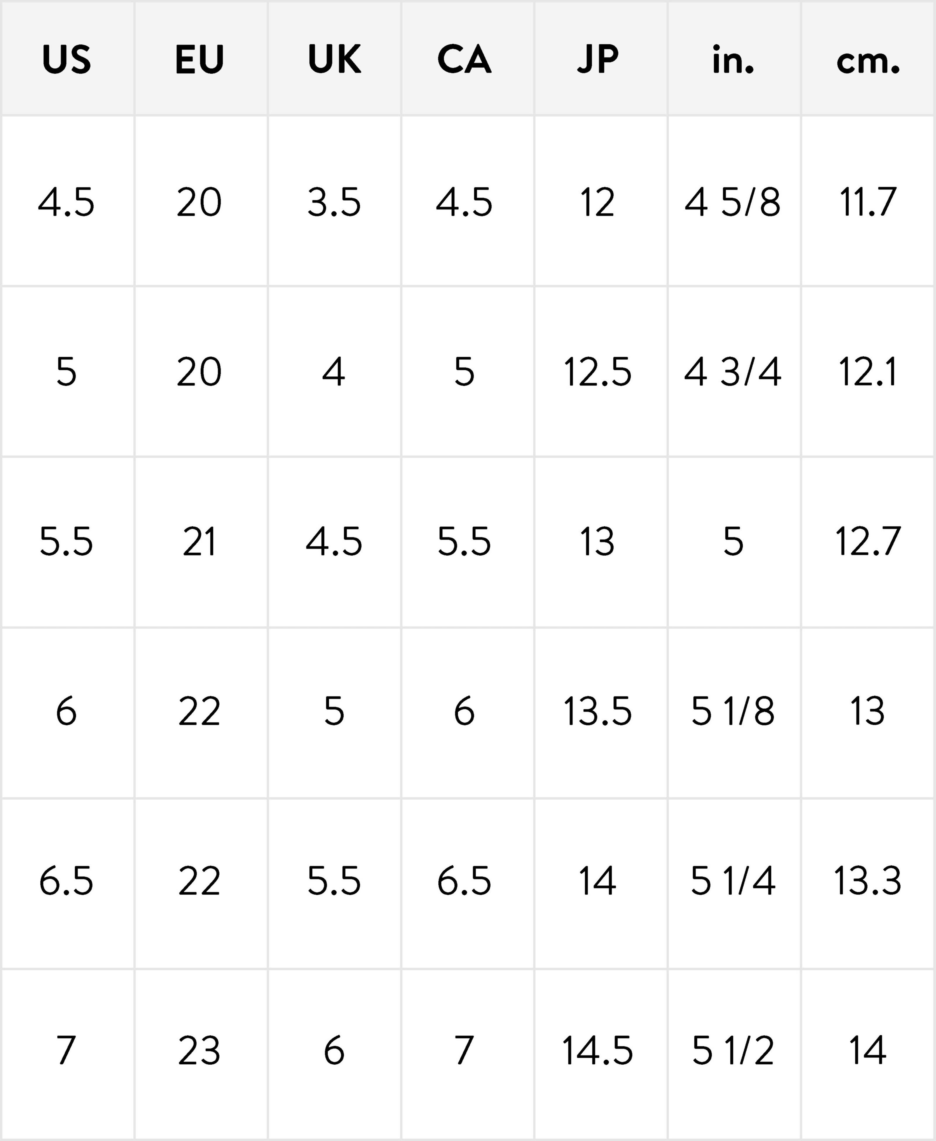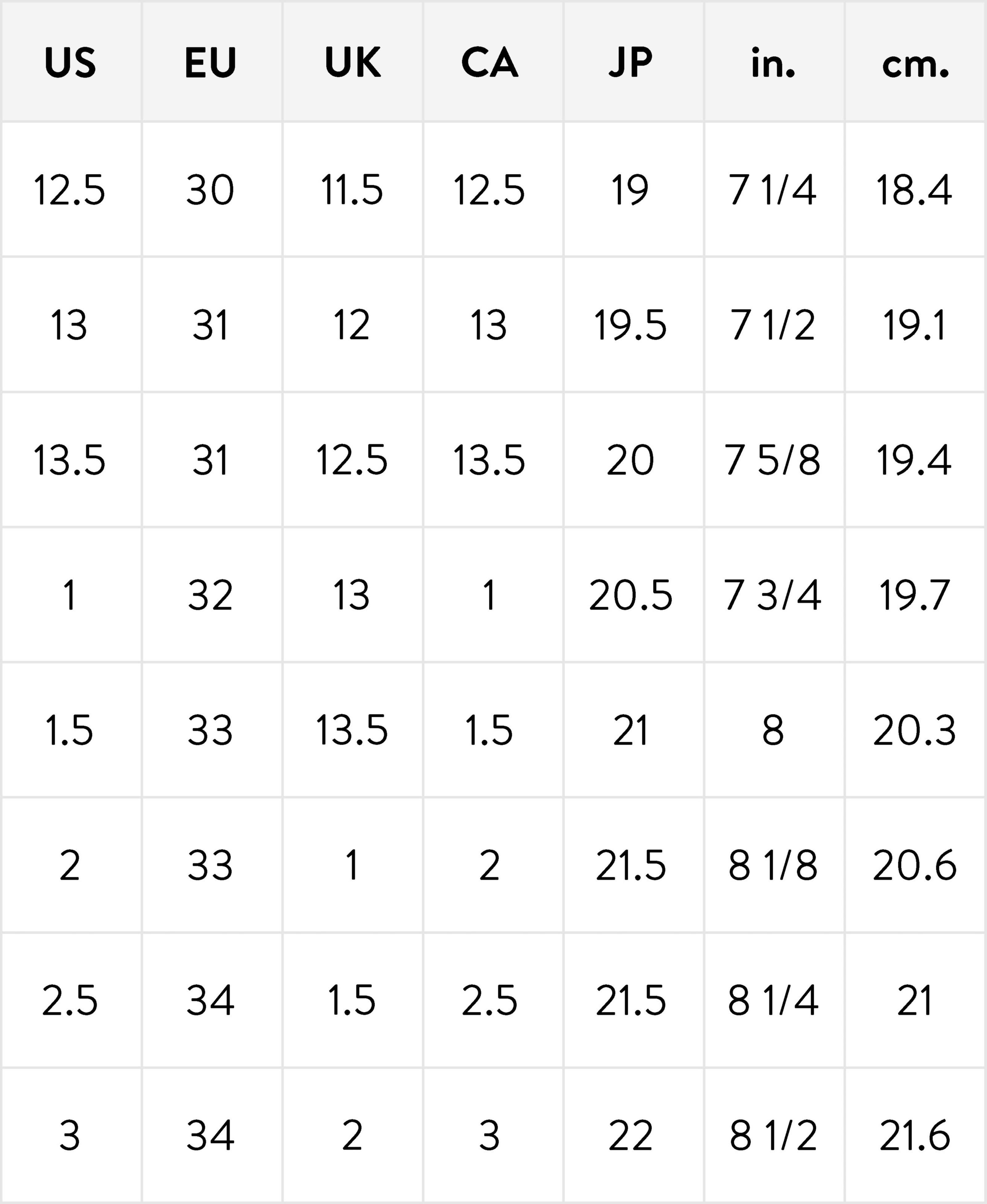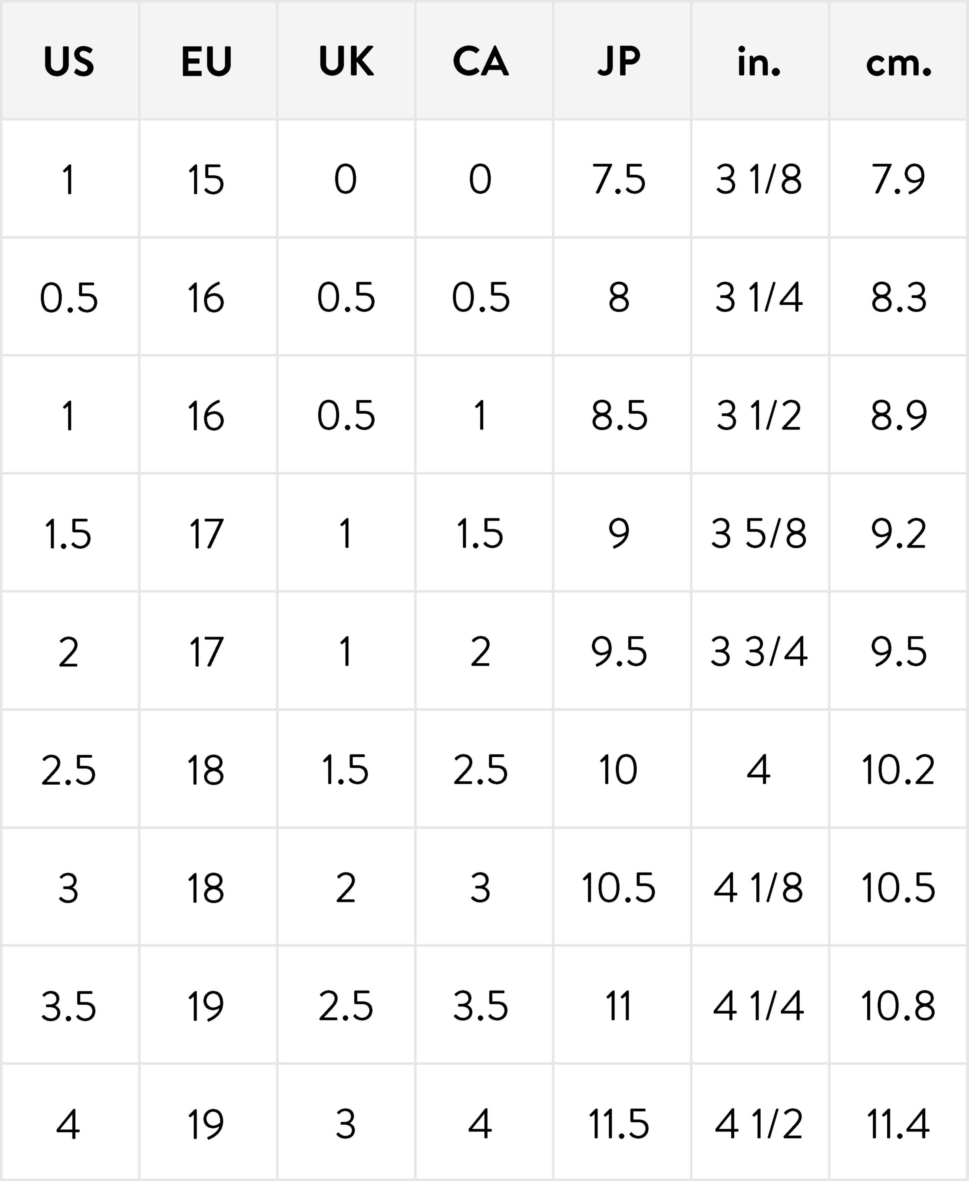 Everything you need to keep pace with your growing tots, from helpful size charts and fit tips to an at-home foot-measuring guide.