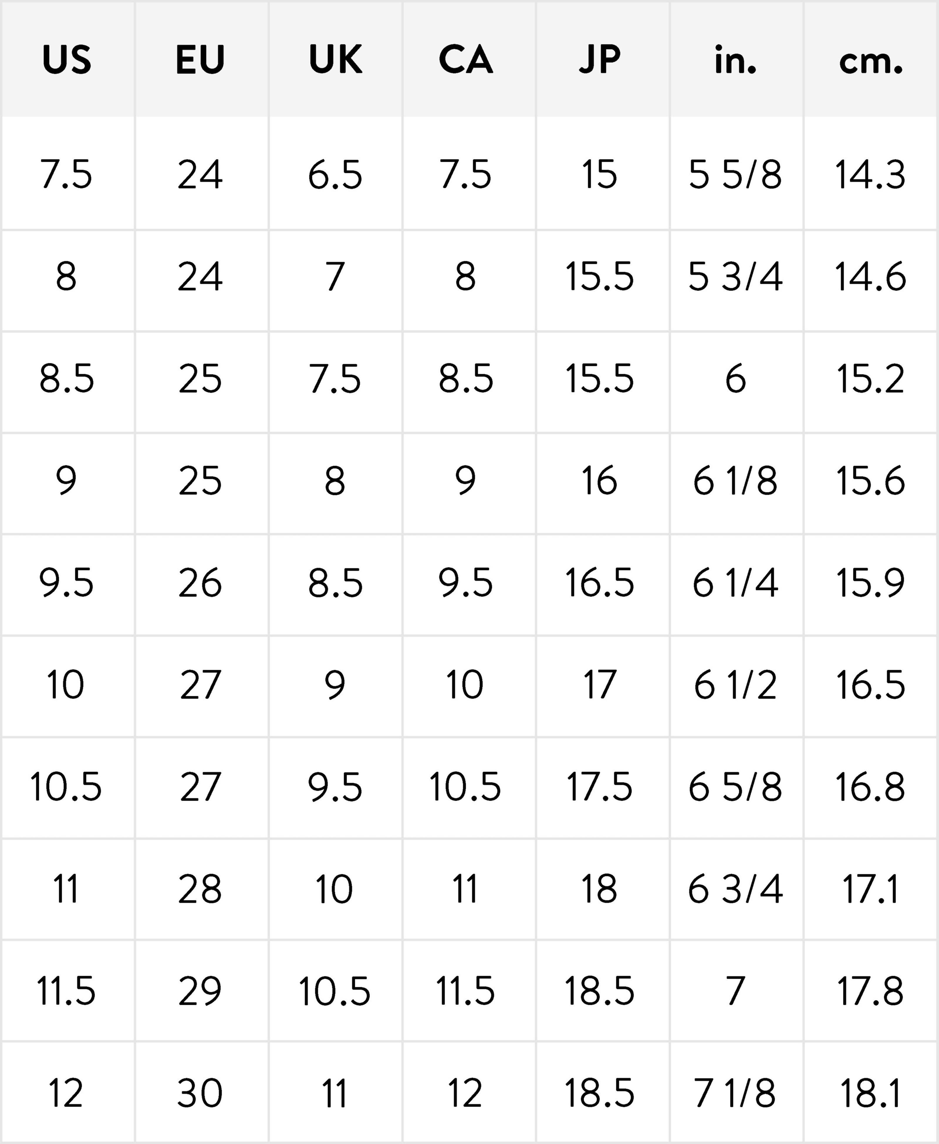 Items may not be offered in all sizes. Measurements in inches and centimeters refer to heel-to-toe length.